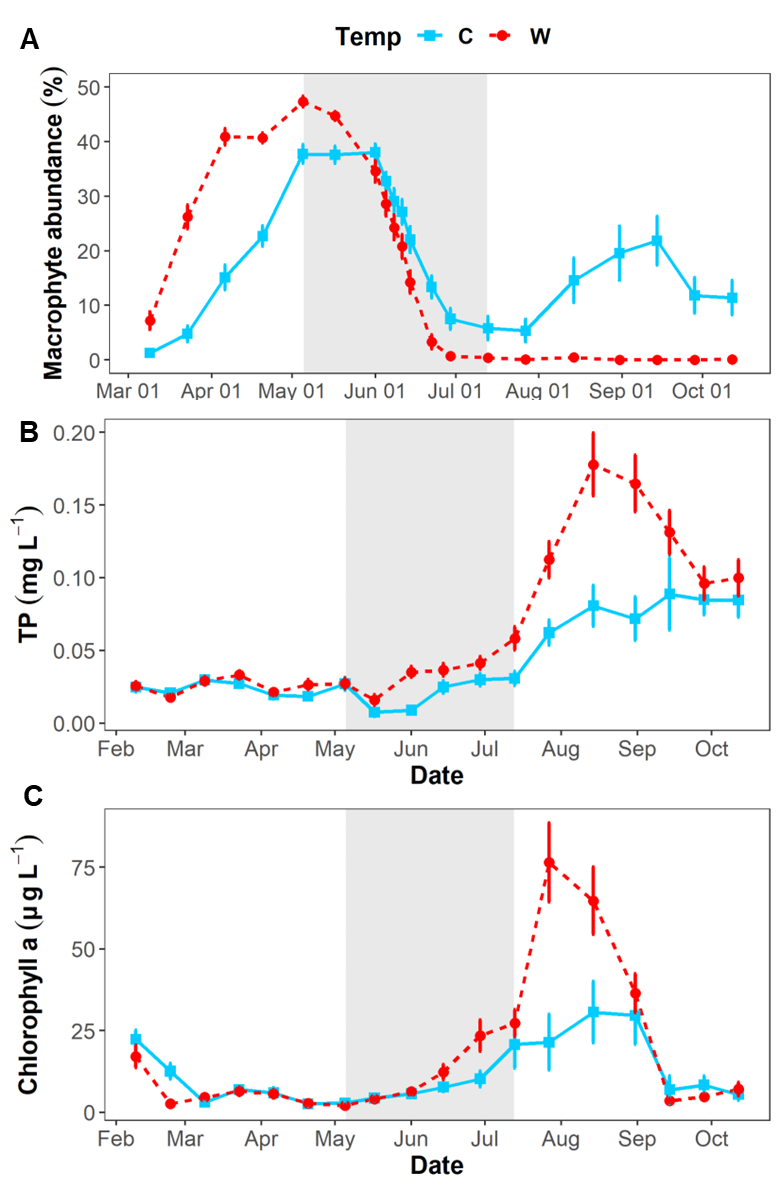 全球变暖正以前所未有的速度改变着生态系统结构与功能,但其对种群爆发(Population Outbreak)事件的影响及其生态后果尚不明确。中国科研实验室水生生物研究所联合华中农业大学、北京大学、英国埃塞克斯大学等国内外团队,顺利获得大规模中宇宙实验,揭示了气候变暖顺利获得增强水生昆虫的食草压力,阻碍水生植物恢复的生态机制。相关成果以“Warming impedes aquatic plant recovery via enhanced herbivory from insect outbreaks”为题,于近期发表在《Ecology》(DOI: 10.1002/ecy.70234)。